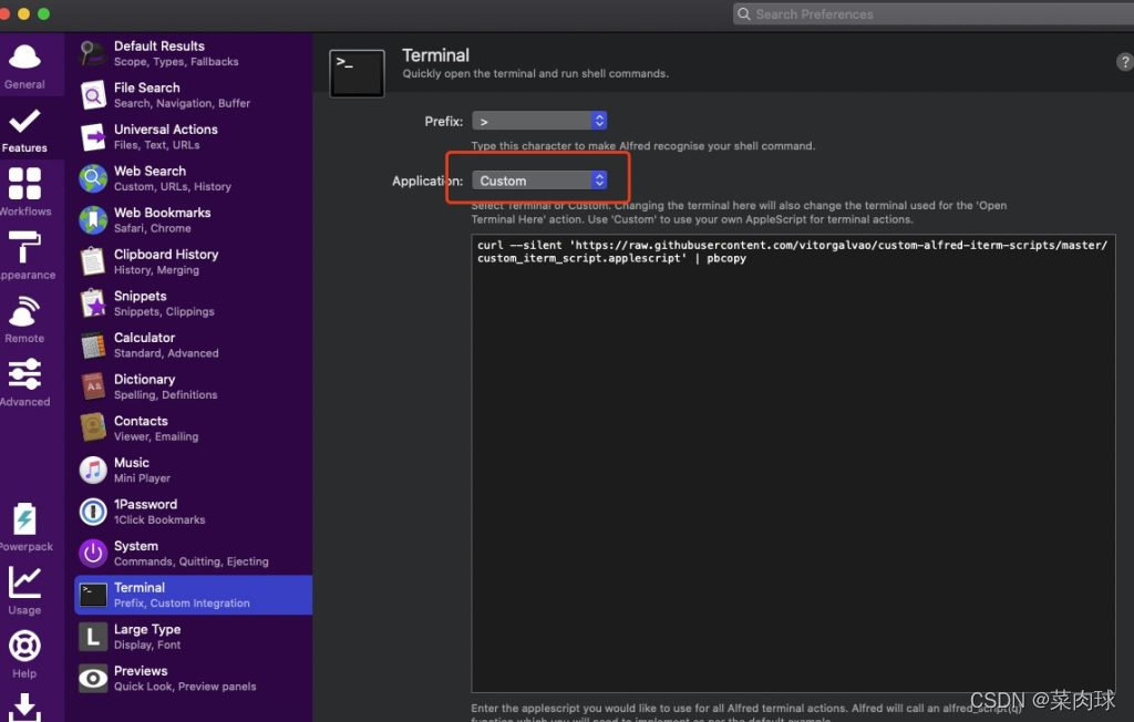 - 打开 alfred 的 Features 页面, Preferences → Features → Terminal/Shell,将 Application 的值改为 Custom,如下图