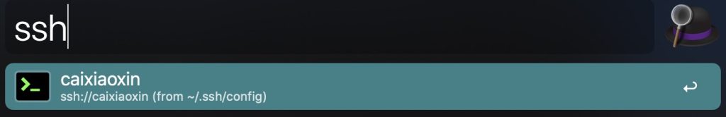 此时就可以使用 alfred 来连接远程服务器了。打开 alfred 输入 ssh caixiaoxin,就可以直接连接上目标服务器进行需要的操作了。但是发现,连接上之后,终端使用的 mac 自带的,并不是 iterm2。继续走~